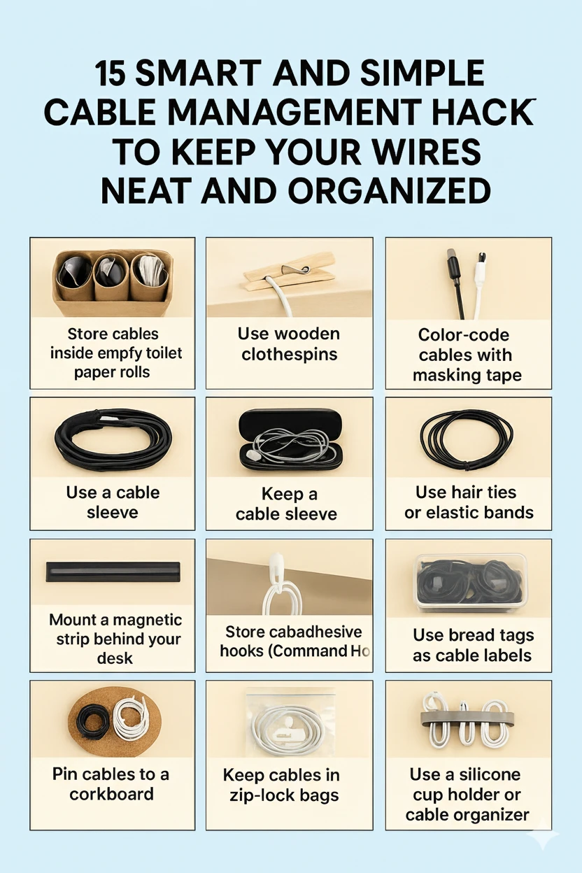 Keeping cables organized doesn’t have to be complicated or expensive. From simple clips and Velcro straps to creative DIY solutions, these hacks make your space cleaner, safer, and much easier to manage. By implementing a few of these tips, you can say goodbye to tangled cords and enjoy a neat, functional setup that makes everyday life a little bit smoother.